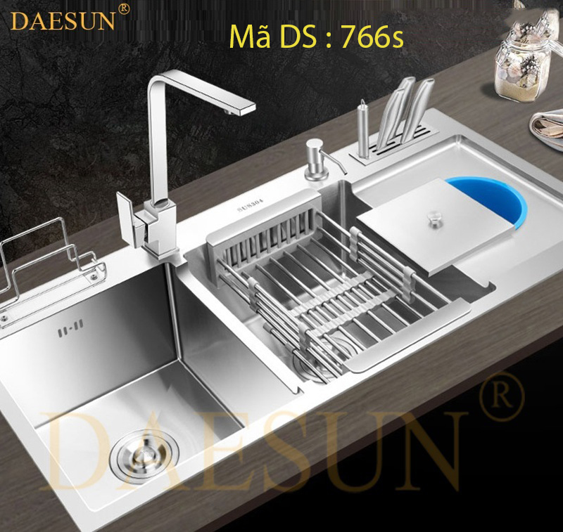 CHẬU RỬA BÁT INOX DAESUN DS 766s ( chuẩn inox 304, có bàn chờ ,hố đựng rác,đế cài dao thớt)