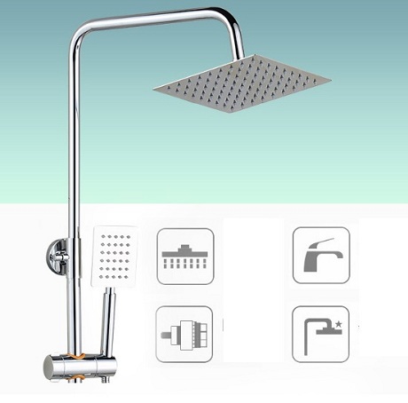 Bát sen và tay sen chất liệu inox 304 thiết kế vuông vức với các lỗ nhỏ tạo áp lực nước mạnh tạo cảm giác thoải mái khi tắm gội.