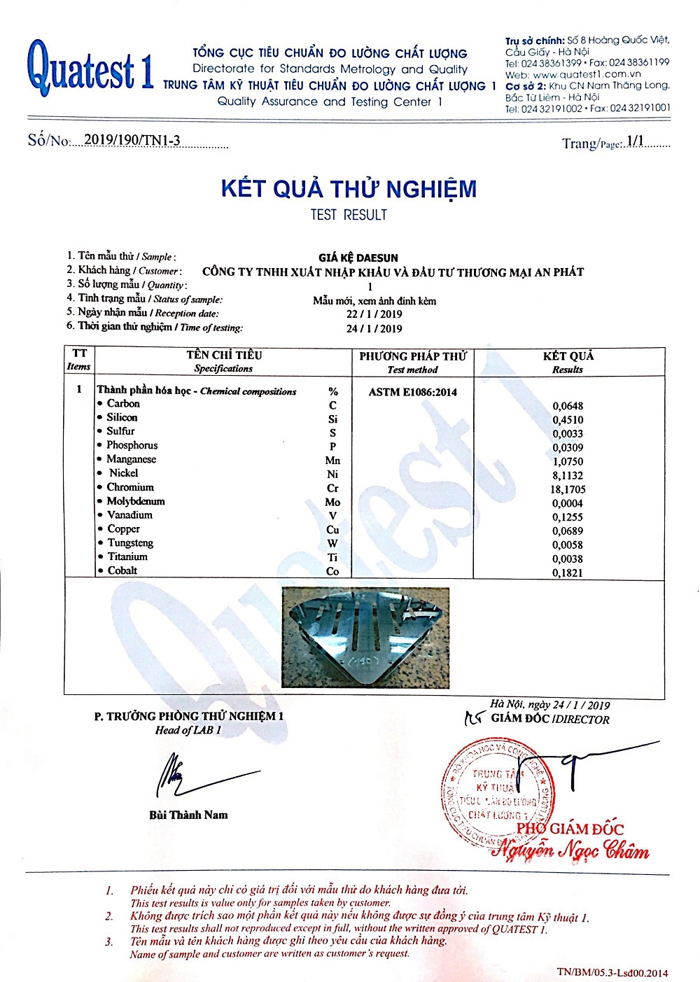 Sản phẩm được Test và chứng nhận bởi Trung Tâm Kỹ Thuật Tiêu chuẩn Đo Lường Chất lượng (Quatest 1)